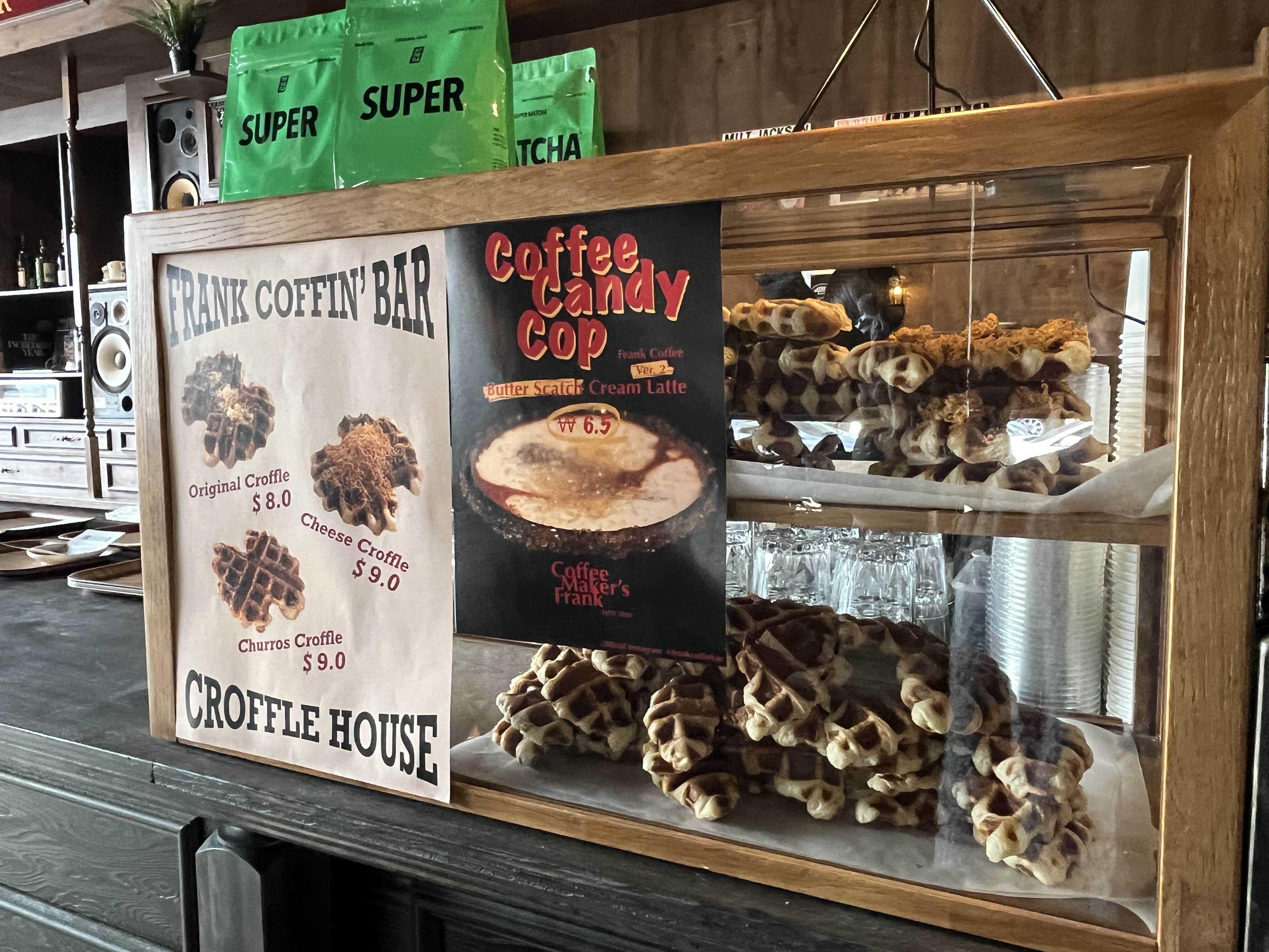 카운터, 그리고 카운터 옆의 맛깔나 보이는 크로플 더미!!
