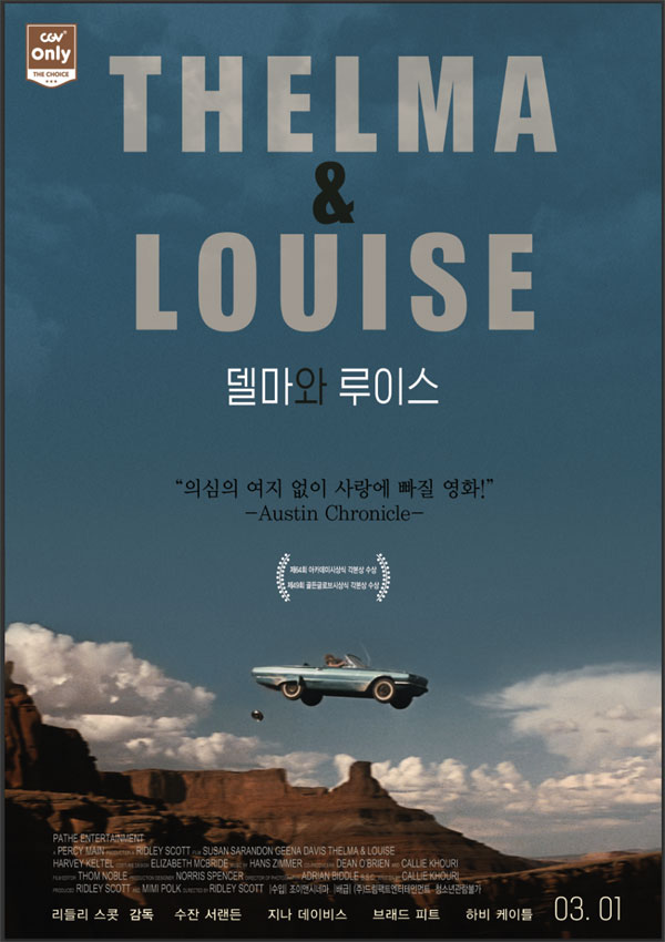 뛰어난 영상미로 '비주얼리스트'라는 별칭을 갖고 있는 영국의 영화감독 리들리 스콧의 「델마와 루이스」입니다. 이 영화로 주연인 수잔 서랜든과 지나 데이비스는 제64회 아카데미 시상식 여우주연상, 촬영상 등 4개 부문에 노미네이트 되었으며, 각본상을 수상하기도 했습니다. 「에이리언(1979)」, 「블레이드 러너(1982)」, 「글레디에이터(2000)」, 「킹덤 오브 헤븐(2005)」, 「마션(2015)」 등 리들리 스콧을 대표하는 수많은 영화 중 가장 좋아하는 작품으로, 페미니즘 영화의 대표로 아직까지도 회자되는 작품입니다.