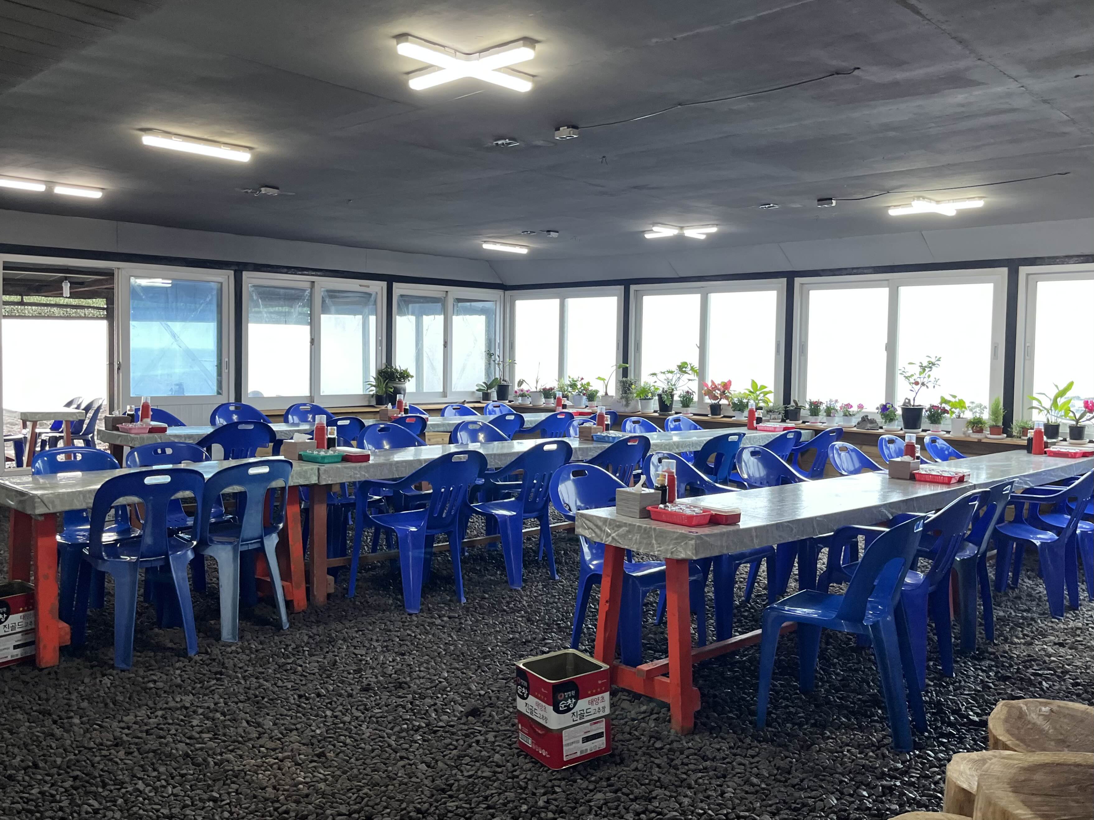 실내에 넓게 깔린 테이블과