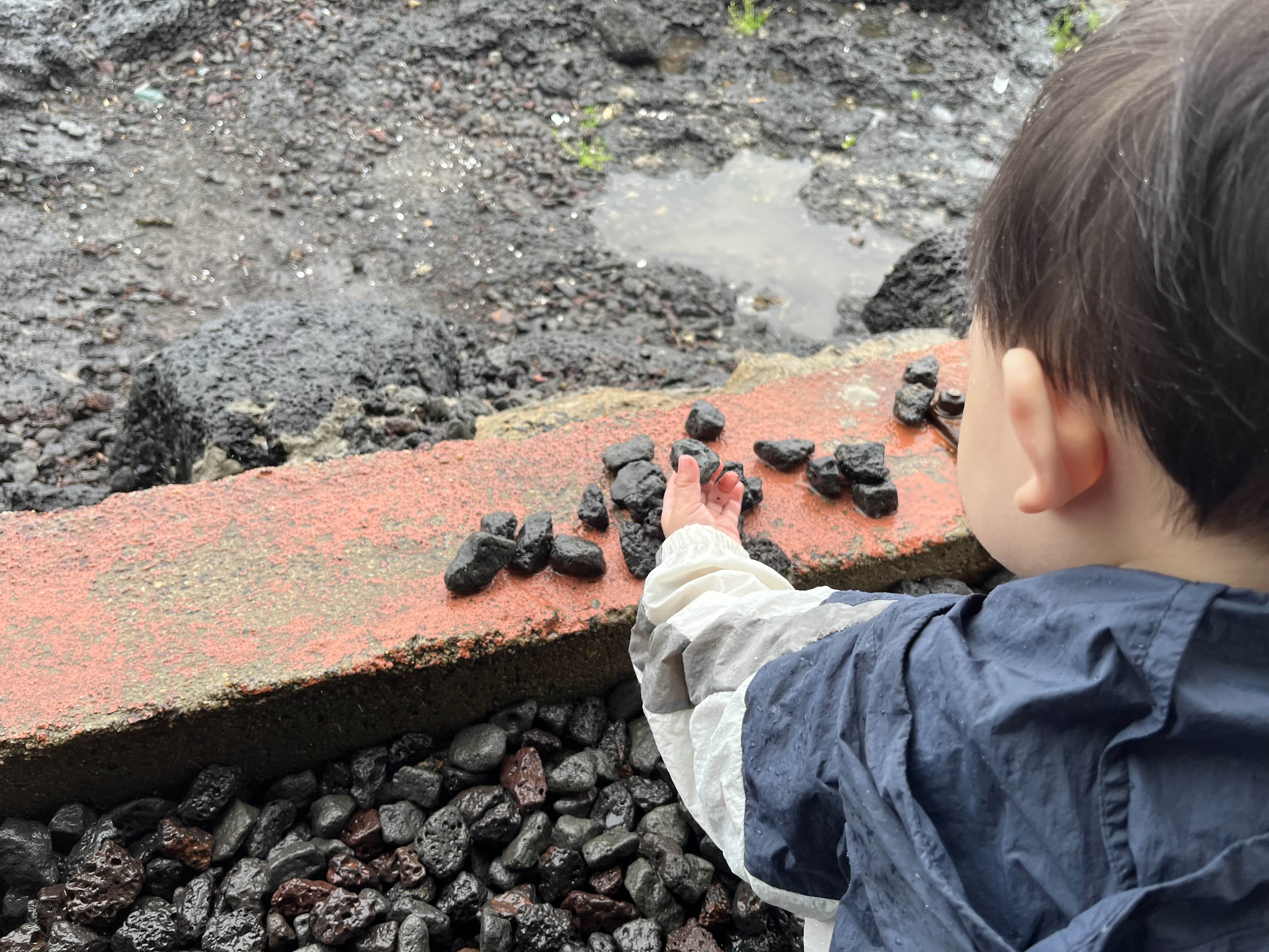 비 오는 날 돌장난 하는 아들